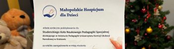 W dniach od 2 do 10 grudnia Studenckie Koło Naukowe Pedagogiki Specjalnej zorganizowało zbiórkę świąteczną na rzecz Małopolskiego Hospicjum dla Dzieci w Krakowie. Celem akcji było wsparcie podopiecznych Hospicjum oraz ich rodzin w szczególnie wyjątkowym, świątecznym czasie. Dzięki ogromnemu zaangażowaniu studentów, pracowników oraz wszystkich osób, które włączyły się w akcję, udało się zebrać wiele potrzebnych … Czytaj dalej Podsumowanie zbiórki świątecznej dla MHD