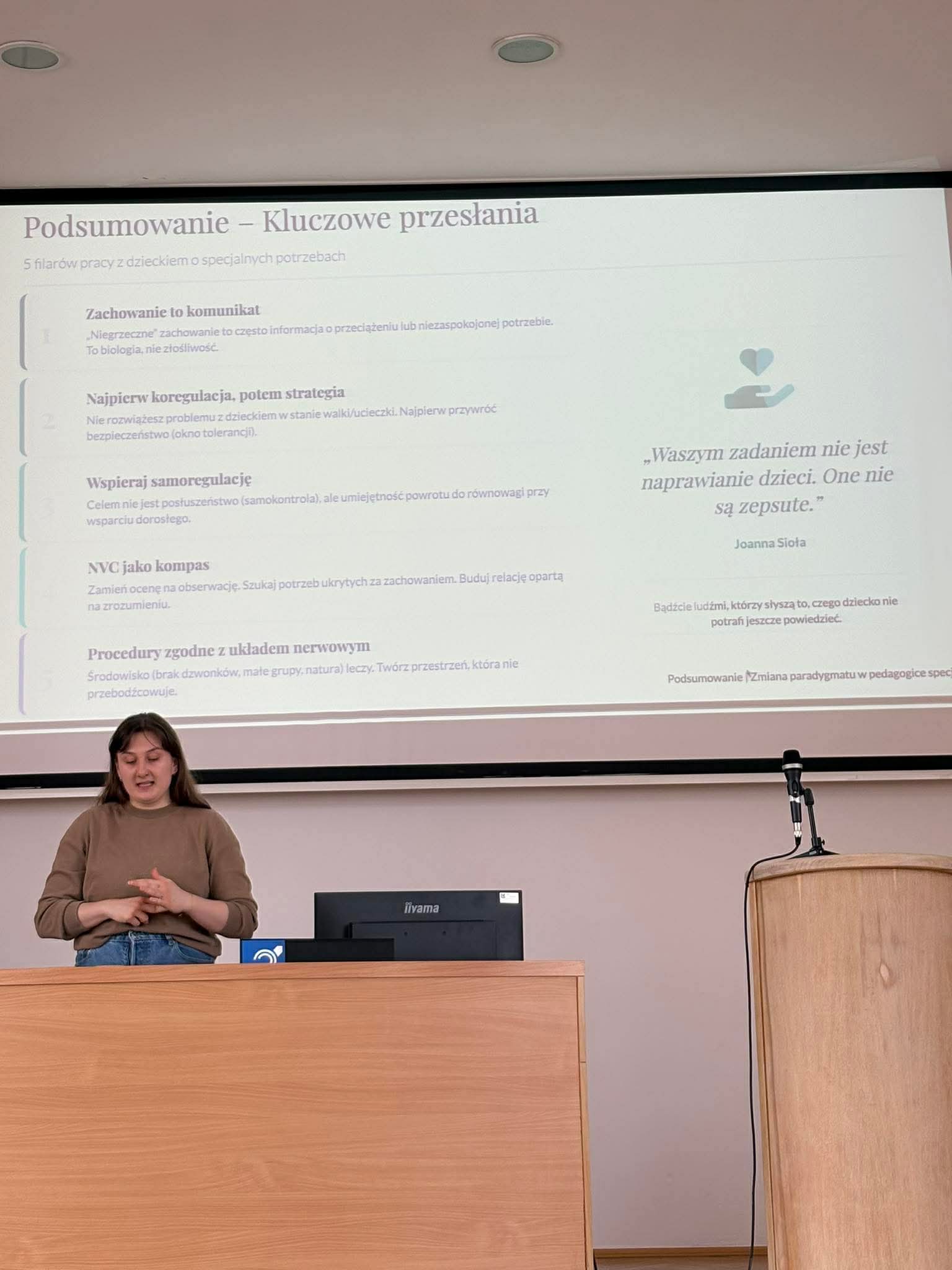 Podczas spotkania prelegentka przybliżyła studentom praktyczne aspekty pracy w nurcie slow education, koncentrując się na budowaniu bezpiecznej więzi jako fundamencie relacji i skutecznej współpracy z dzieckiem. Szczególną uwagę poświęcono możliwościom wykorzystania założeń Porozumienia bez Przemocy (NVC) w codziennej pracy z dziećmi wykazującymi wyzwania rozwojowe. Podkreślono, że za każdym trudnym zachowaniem stoi konkretna, niezaspokojona potrzeba dziecka.