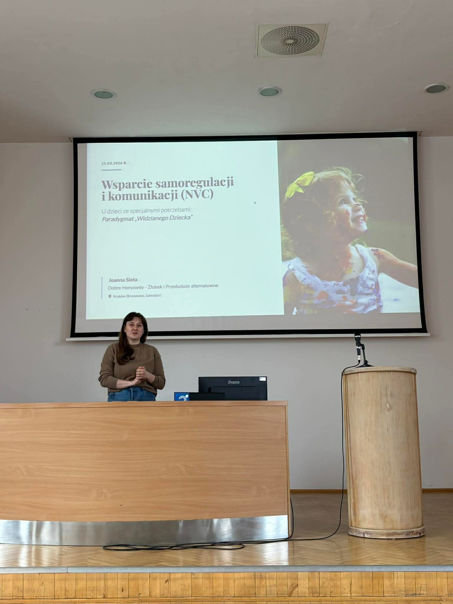 Na zaproszenie Koła Naukowego Pedagogiki Specjalnej, dnia 25 marca 2025 roku o godzinie 11:30 w auli Instytutu Pedagogiki odbyła się inspirująca prelekcja prowadzona przez Panią Joannę Siołę – założycielkę bliskościowego żłobka i przedszkola „Dobre Horyzonty”.