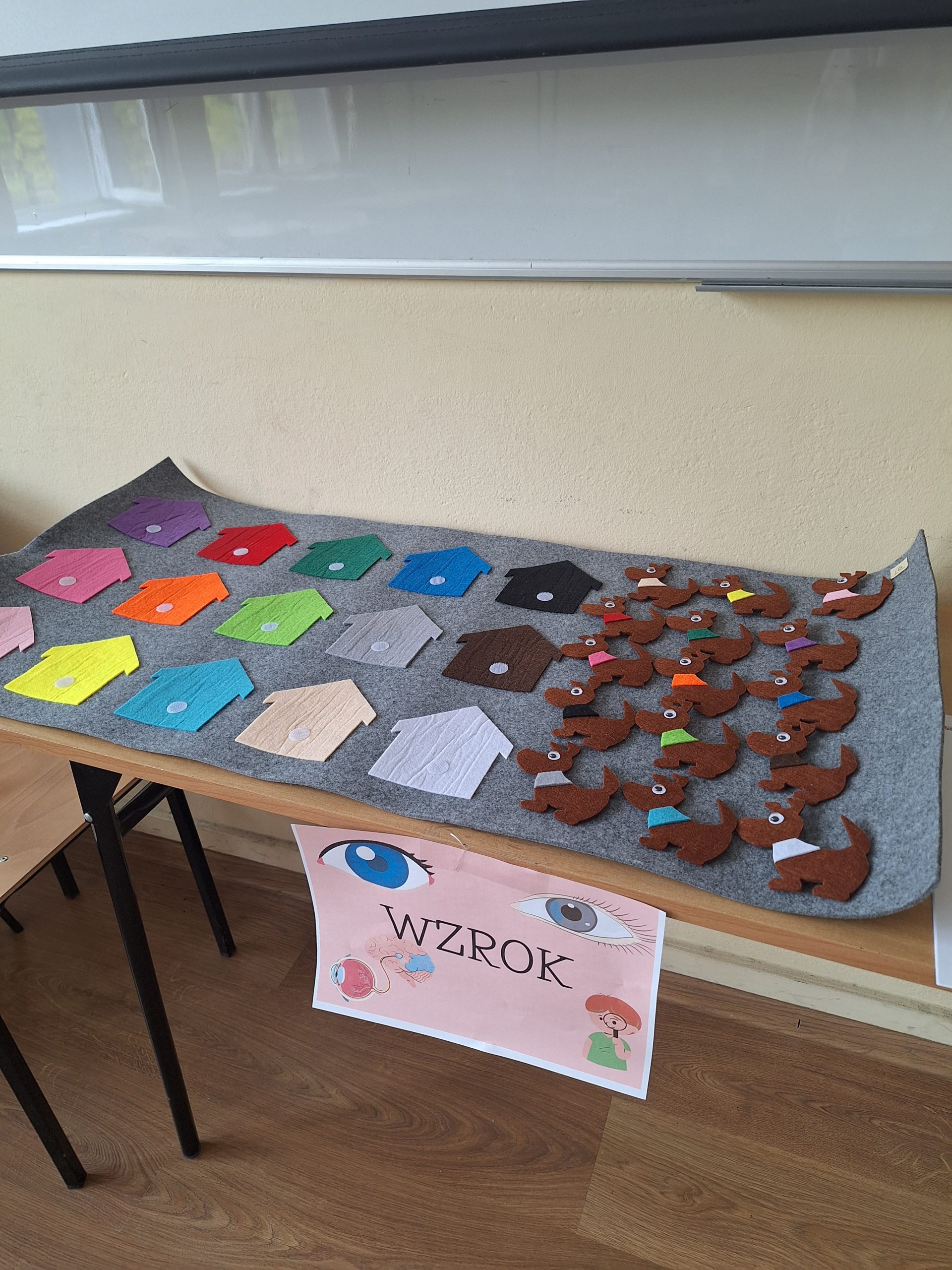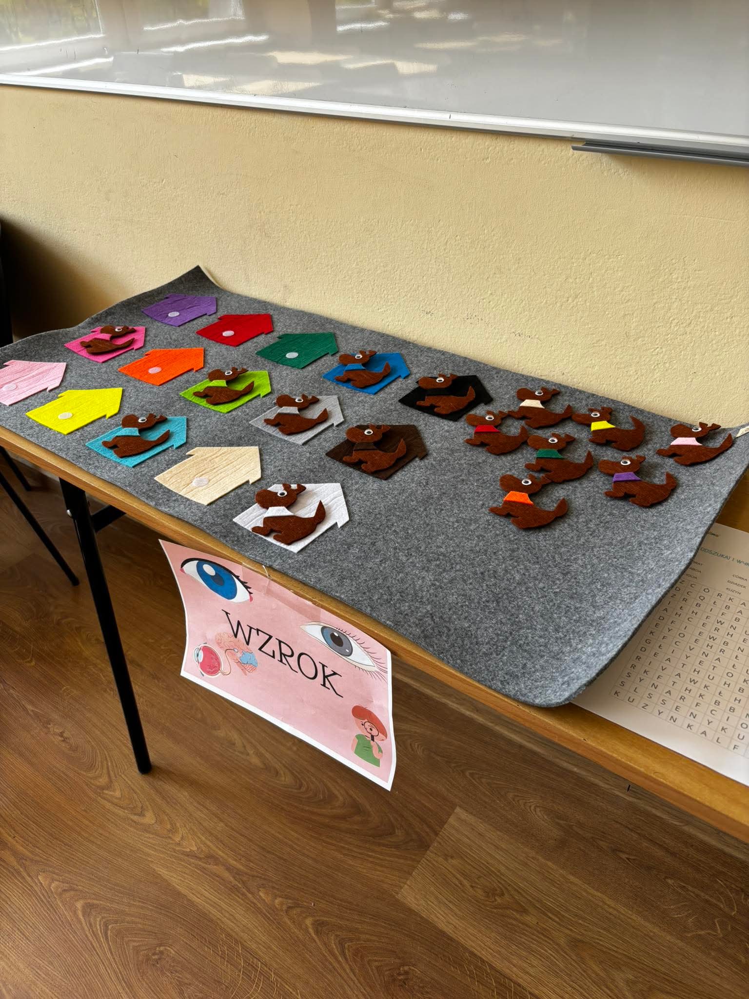 - Wzrok: zadania z kontrastami i dopasowywaniem elementów (np. filcowe pieski i budy), a także ćwiczenia w okularach odwracających obraz „do góry nogami”.