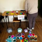 - Dotyk: ścieżki sensoryczne o różnych fakturach (pióra, guziki, pompony) oraz panele manipulacyjne.